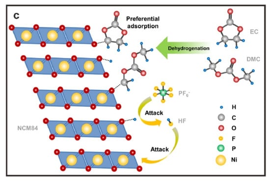 The onset temperature of thermal decomposition is already reduced by the carbonates, in particular dimethyl carbonate (DMC), and further reduced by the introduction of LiPF6. Furthermore, the outward migration of oxygen is accompanied with an outward migration of Ni. This process of Ni and O co-migration along (003) planes was observed, for example, in NMC811 []. This continuous advance of the surface degradation layer toward the particle interior results in an increase of the thickness of the surface inactive rock-salt phase layer, leading to a rapid degradation of the electrochemical properties []. In addition, during the delithiation process, the outward diffusion of Li+ generates a concentration gradient and vacancies in the layered structure []. The smaller variation of the lattice in the Li-rich (vacancy-poor) domains along the c-axis direction than in Li-poor (vacancy-rich) domains results in an anisotropic lattice contraction that may induce microcrack formation at grain boundaries [,].
