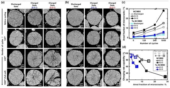 Cross-sectional SEM images of the (a) NCM90 and (b) Ta-doped NCM90 cathodes at fully discharged (2.7 V) or charged state (4.3 V, at 0.5 or 5.0 C) depending on number of cycles. (c) Areal fraction of microcracks in cathodes plotted against number of cycles. (d) Charging rate capability of cathodes with respect to areal fraction of microcracks at 120th, 240th, and 1000th cycles. Reproduced from ref. []. Copyright 2024 Wiley.