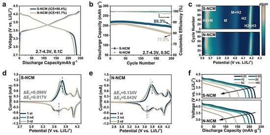 The influence of the precursors on the electrochemical performances of Ni-rich layered oxides has been discussed by several workers. Cui et al. [] investigated the effect of cationic uniformity in the precursors on Li/Ni mixing of Ni-rich layered cathodes. The cationic uniformity in precursors is regulated by the sol–gel and solvothermal method. All cations in the precursors obtained by the sol–gel method mix uniformly at a molecular scale, while the solvothermal method with a post-addition of Li salts causes a heterogeneous mixture between Li and transition-metal ions. Therefore, advanced Ni-rich layered cathodes should simultaneously possess low Li/Ni mixing and reversible H2–H3 transition.