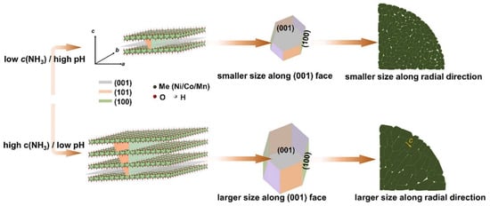 Schematic illustration of growth of grains synthesized at different pH at different ammonia concentration in precipitation process. High ammonia concentration induces crystal growth along the direction perpendicular to [001] and the direction parallel to [001]. With the maximized face along the (001) crystal face and proper size along the (100) crystal face, a precursor with radially ordered structure is easily formed. Reproduced from ref. []. Copyright 2024 Elsevier.