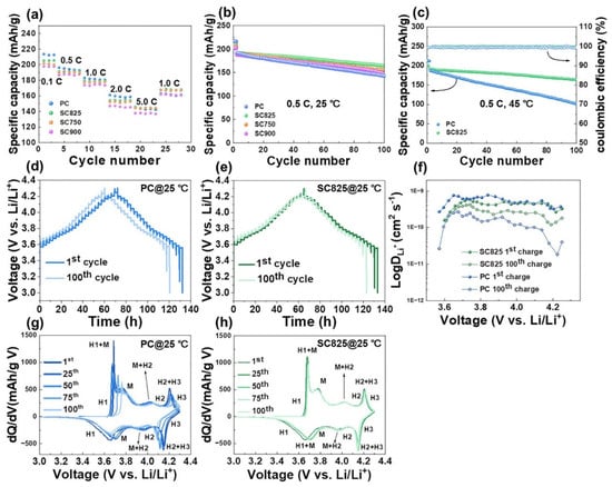 Electrochemical properties of polycrystalline (PC), and single-crystal (SC) LiNi0.92Co0.04Mn0.04O2 synthesized via LiCl-NaCl molten-salt method at different temperatures (750, 825, and 900 °C). (a) Rate capabilities of PC, SC750, SC825, and SC900 cathodes (RT). (b) Cycling performance of PC, SC750, SC825, and SC900 cathodes at 0.5 C (RT). (c) Cycling performance of PC and SC825 at 0.5 C (45 °C). (d,e) GITT curves of PC and SC825 cathodes during charge/discharge process and (f) corresponding diffusion coefficient. (g,h) dQ/dV curves of PC and SC825 cathodes, respectively. Reproduced from ref. []. Copyright 2024 under Creative Commons CC BY license.