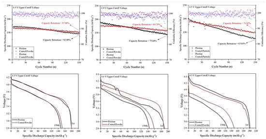 Electrochemical properties of bare and Al2O3-coated NMC811 over 150 cycles (1 C) at 4.3, 4.4, and 4.5 upper cutoff voltages. Upper figures compare cycling stability of samples, while lower figures illustrate voltage fading after 150 cycles. Reproduced from ref. []. Copyright 2024 under the Creative Commons CC BY license.