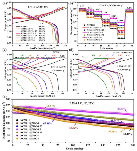 Electrochemical properties of NMC811 uncoated and coated with different NiFe2O4 (NFO) weights (in wt.%). (a) Initial charge/discharge profiles of different cathodes at 0.1 C, (b) rate capability, (c,d) capacity–voltage curves at various current densities, and (e) long-term cycling performance at 1 C of prepared cathodes (within 2.75–4.3 V at 25 °C). Reproduced from ref. []. Copyright 2024 American Chemical Society.