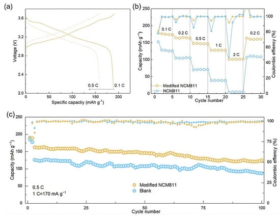 Coating fluorides on Ni-rich cathode materials can reduce charge transfer resistance and thus improve rate capability, but also increase the cycle life. Directly coating LiF on the surface of Li1.2Ni0.2Mn0.6O2 stabilized the cathode over 280 cycles and maintained a capacity of 110 mAh g−1 at 1 C []. Metal fluoride materials have better resistance to HF attack than metal oxides, and can thus be utilized to coat Ni-rich cathodes. In particular, AlF3 is known for its beneficial effects in Li-ion batteries []. In NMC-based cells, however, AlF3 coating has been used mainly in NMC333 []. On the other hand, NMC811 was coated with PrF3 []. This cathode exhibited a capacity retention of 86.3% after 100 cycles at 1 C.