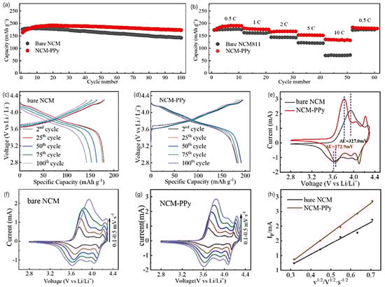 NMC811 coated with PPy (a) Cycling performance at 2 C and (b) rate capability. (c,d) GCD curves at different cycles of NMC811@PPy and bare NMC811. (e) CV comparation between NMC811 and NMC811@PPy with rates of 0.5 mV s−1. CV curves of (f) NMC811 and (g) NMC811@PPy with scan rates increased from 0.1 to 0.5 mV s−1. (h) Plots of peak current density as a function of the square root of the scan rate. Reproduced from ref. []. Copyright 2023 Elsevier.