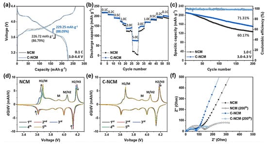 Yoon and Shin utilized a cyclopropenium cationic covalent organic framework (C-COF) as a coating material of NCM with 94% Ni content. In the C-COF skeleton, cation moieties attract PF6− anions in the Li salts of the electrolyte, suppressing the solvation between Li+ and PF6−. This coating increased the diffusion coefficient of the lithium by a factor 3, and increased the capacity retention from 60.17 to 71.31% after 200 cycles at 1 C (see Figure 10) []. A summary of the effect of different coatings on the cycle ability of Ni-rich cathodes is reported in Table 1.