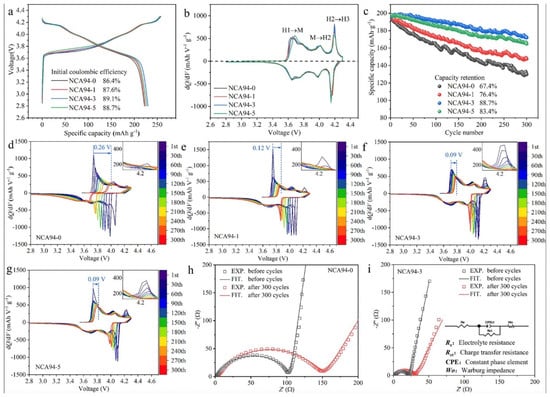 Galvanostatic charge–discharge measurements and EIS results. (a) Initial charge–discharge curves at 0.1 C. (b) Differential capacity plots derived from 0.1 C charge–discharge curves. (c) Cycling performances at 2 C. (d–g) Differential capacity plots derived from 2 C charge–discharge curves at different cycles. (h,i) Nyquist plots of pristine LiNi0.94Co0.02Al0.04O2 (NCA94-0) and NCA94 doped with 3 wt.% Nb (NCA-3) after 300 cycles at 2 C. Reproduced from ref. []. Copyright 2023 Elsevier.
