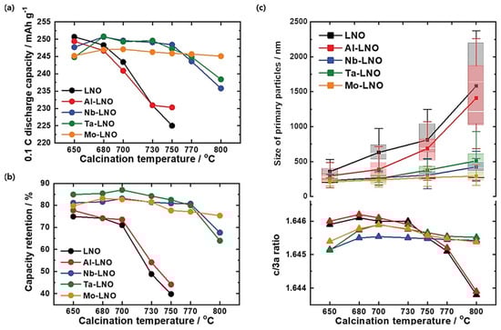 In situ operando analyses now give a comprehensive understanding of elemental doping of Ni-rich materials [,]. Fe3+ and Sn4+ with ionic radii larger than substituted Co3+ expand Ni-rich NMC crystal lattices horizontally [], while Ca2+ (with a radius larger than Ni2+) can expand lattices horizontally []. An extensive review on the results published on 46 dopant elements in NMCs through the years has been published by Ko et al. []. Hereunder, we focus attention on the best results obtained in recent years. Such doping elements include Mo6+ [,,,], W6+ [,,,,,,,,,,], Te6+ [], Ta5+ [,,,,,,,] Nb5+ [,,,,], Ce4+ [], Zr4+ [,,,], Ti4+ [,,,,,,,], Ge4+ [], Hf4+ [], Sn4+ [], Ce4+ [], Gd3+ [], and Al3+ [,]. Al-doping alleviates anisotropic lattice changes and volume changes during cycling. It also maintains a wider LiO6 inter-slab thickness without collapse at highly charged states, allowing Li-ions to be deintercalated/intercalated reversibly []. As a result, Al-doped LiNi0.7Co0.1Mn0.2O2 at a high cut-off voltage (4.4 V) delivered a capacity of 144.69 mAh g−1, with a capacity retention of 80.26% after 90 cycles at 1 C []. Due to the Al-doping, LiNi0.92Co0.03Mn0.03Al 0.02O2 demonstrates a capacity retention of 92% after 100 cycles at 0.5 C rate, against 69% with undoped LiNi0.94Co0.03Mn0.03O2 []. An important parameter is the concentration of Al, 2% in this case, while the optimized concentration is 3% after Kim et al. []. They reported that Li[Ni0.894Co0.041Mn0.034Al0.031]O2 cathode demonstrates excellent long-term cycling stability, retaining >90% of its initial capacity after 500 cycles, while the Li[Ni0.91Co0.04Mn0.04Al0.01]O2 cathode loses 38.3% of its initial capacity after 500 cycles []. Positive effects of Al-doping have also been observed with cobalt-free cathodes, such as LiNi0.90Mn0.06Al0.04O2 [], LiNi0.8Mn0.16Al0.04O2 [], LiNiO2 [], Al-doped NCM [], and LiNixMn1–xO2 [], although the electrochemical performance remains below that of Co-containing Ni-rich cathodes, even with single crystallized particles []. Other doping elements of Ni-rich elements include Gd3+ [], Cr3+ [,], Sc3+ [], Y3+ dopant of both NMC [] and NCA [], La3+ [], Mg2+ [,,,,,,], Ca2+ [], Sr2+ [,], Zn2+ [,], Ag+ [], and Na+ [,,].
