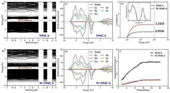 Among metal oxides, Al2O3 coating has been most investigated, because of its efficiency. In particular, it introduces new energy levels that prevent the reduction of Ni ions by O2− [,,] (see Figure 6). It can also suppress the Li-Ni cation mixing. It also maintains stabler cathode–electrolyte interface []. Wang et al. reported a surface-targeted healing (TH) strategy through atomic layer deposition of Al2O3 []. The modified NMC811 cathodes exhibited 78.6% capacity retention after 400 cycles at 1 C and 55 °C compared to 70.6% after 200 cycles for the pristine material). Cheng et al. coated polycrystals of LiNi0.83Mn0.05Co0.12O2 with Al2O3 by ALD and a subsequent annealing method according to which the sample was placed at a high temperature of 750 °C and annealed for 2 h. With this process, the primary grains remain intact, and the Al is enriched at the grain boundaries only. After 300 cycles at 4.3 V and at rate C/3, this cathode maintained 143.8 mAh g−1 with 84.7% capacity retention, compared to 118.6 mAh g−1 in case of gradual heating annealing []. This improvement was attributed to the rapid heating process, which minimizes Li/O loss and prevents the formation of a disordered phase. It is worth noting that a rapid heating process (by microwave technics in this case) has recently been used to synthesize a Ni-rich Co-free LiNi0.9Fe0.05Al0.05O2 with also improved electrochemical properties with respect to gradual heating annealing [].