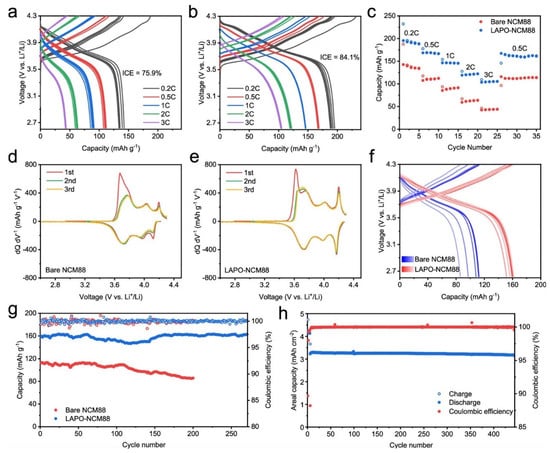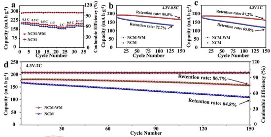 Lithium boron oxide (LiBO) coating of NCA increases the capacity retention to 93.59% after 100 cycles at 2 C []. Dot-like Nb12WO33 plus uniform LiBO coating of Li(Ni0.90Co0.06Mn0.04)0.995Al0.005O2 Nb12WO33 provided a rapid Li transmission channel, improving the rate capability with respect to the L-B-O coating alone, with a discharge capacity of 179.1 mAh g−1 at 5 C []. The LiBO-coated LiNi0.90Co0.06Mn0.04O2 material showed a discharge capacity of 222.0 mAh g−1 with 88.1% of capacity retention after 100 cycles at 1 C []. Qiao et al. synthesized Li2SiO3-coated NMC811 (NCM@LSO) by the precoating and solid-state lithiation methods. The capacity retention reached 97% after 500 cycles at 0.5 C, while that of bare NCM was limited to 79% after 450 cycles []. Xiao et al. synthesized LiNi0.8Co0.15Al0.05O2 using CoAl-layered double hydroxide (CoAl-LDH) nanosheet-coated Ni(OH)2 as the precursor, improving significantly the properties of NCA, compared with NCA synthesized from nickel–cobalt–aluminum hydroxide and Al(OH)3-coated nickel–cobalt hydroxide precursors. The improvement was attributed to the formation of a Li1–x(Co0.75Al0.25)1+xO2 mesophase as the buffer layer, reducing the Li+/Ni2+ cation mixing. In addition, the presence of Co on the surface promoted the diffusion of Al during the lithiation–calcination process, thus avoiding the formation of undesired Al-related phases. This cathode delivered a discharge capacity of 194.5 mAh·g−1 at 0.1 C and a capacity retention of 90.9% after 100 cycles at 0.2 C [].