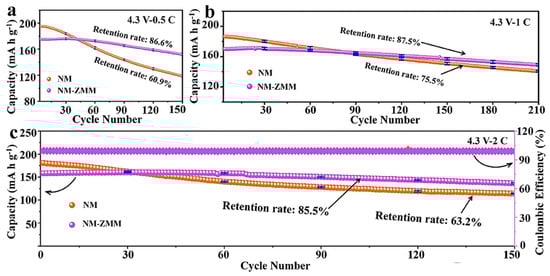 All the transition metal doping elements we have mentioned form stronger bonds with oxygen and reduced energy loss, promote lithium migration, and reduce the Ni/Li mixing of NMCs. Nevertheless, among V, Nb, and Zr doping, V-doping is the most advantageous to improve the electrochemical properties of NMC811 by reducing significantly the lithium divacancy barrier []. This may not be true, however, for NCA cathodes, because this effect in NMC comes from the suppression of the lattice distortion, due to the radius of V5+ being close to the radius of Mn4+. Actually, 0.3 wt.% Nb-doped LiNi0.94Co0.02Al0.04O2 delivers 172 mAh g−1 after 300 charge–discharge (voltage window: 2.8–4.3 V) cycles at 2 C (see Figure 11) []. Recently, Li et al. investigated the relationship between the diffusion depth and distribution behavior of foreign elements within the cathode material and the composition of the Li-rich cathode material. They determined the diffusion coefficients between Zr4+ and transition metal elements TMn+ (TM = Ni, Co, Mn; n = 3, 4) []. As a result, these coefficients follow the trend: Zr4+/Mn4+ > Zr4+/Mn3+ > Zr4+/Co3+ > Zr4+/Ni3+, the Zr4+/Mn4+ diffusion couple having the smallest diffusion activation energy of only 0.43 eV. In particular, this work explains the reason for the formation of a Li2ZrO3 secondary phase coating layer on the surface of Ni-rich cathode material particles.