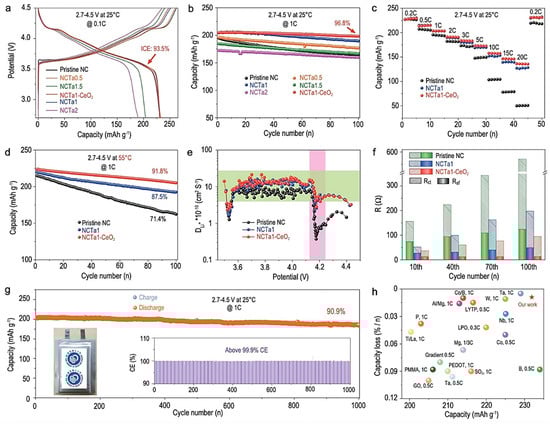 A drawback of these oxide-based materials utilized to coat the Ni-rich cathode materials their small ionic conductivity. It is thus desirable to investigate more conductive coatings [,]. In particular, MoO3 is attractive, because its ionic conductivity is orders of magnitude larger, compared to Al2O3 or MgO. MoO3-coated NMCs demonstrated the superior capacity retention of 79.8% under the high 5 C []. Benefitting from a high ionic and electronic conductivity of NiFe2O4, a NiFe2O4-coated NMC622 cathode achieved a capacity retention of 81.72% after 100 cycles (at 60 °C@1 C) and an excellent rate capability (109.86 vs. 49.52 mAh·g−1 for the pristine material at 10 C) []. This coating was recently extended to NMC811 [] (see Figure 7). The NiFe2O4-coated NMC811 exhibited a superior rate capability of 112.7 mA h g−1 at 10 C, and high-temperature stability of 130 mA h g−1 after 100 cycles at 60 °C. Li2SiO3 is also employed, as it is a fast ionic conductor []. TiNb2O7 coating was found beneficial to the electrochemical performance of LiNi0.88Co0.06Mn0.06O2, by significantly improving the capacity retention of modified material after 200 cycles at 1 C from 59.8% of the pristine material to 87.2% []. A 0.3% Nb2O5-coated NMC811 cathode exhibits superior rate capability (146.4 mAh g−1@400 mA g−1) and remarkable rate cyclic stability (188.5 mA h g−1 after 100 cycles with capacity retention of 94.8% [].
