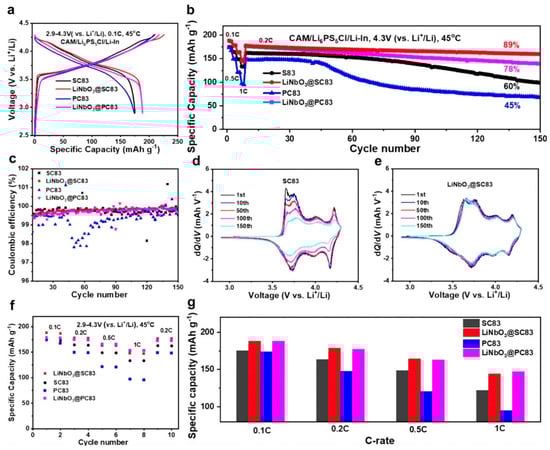 Liu et al. reported LiNbO3+Li3BO3 dual-coating of single-crystal Li[Ni0.92Co0.06Mn0.02]O2) (SC-Ni0.92). The all-solid-state battery with this cathode Li6PS5Cl solid electrolyte and Li-In anode exhibited a capacity retention rate of 88.4% for 100 cycles at a current density of 1.5 mA cm−2 (1 C) and a discharge capacity of 150.1 mAh g−1 at a high current density of 7.49 mA cm−2 (5 C) []. This performance was attributed to the melting of Li3BO3 during hot sintering, which diffused into the crystalline LiNbO3 coating to form a dense coating. Yang et al. reported LiF+Li3BO3 dual-coating of NMC811. This cathode achieved a capacity of 205.4 mAh·g−1 within a voltage window of 2.8–4.5 V at 1 C. with a capacity retention of 70.6% after 500 cycles [].