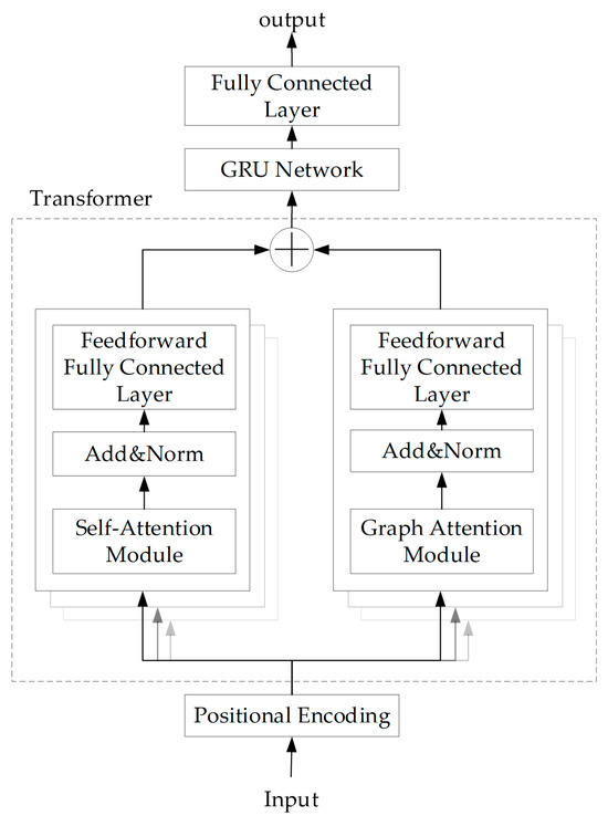 This study proposes a hybrid architecture that integrates a GAT into the Transformer encoder to explicitly model spatial correlations among battery cells (e.g., thermal coupling and fault propagation pathways), overcoming the limitations of pure Transformer architectures in capturing physical topological relationships. The conventional Transformer decoder is replaced with a GRU enabling efficient temporal dynamics modeling through its gating mechanisms and addressing the inefficiency of pure GRUs in capturing long-term dependencies. The integration of a GAT and GRU achieves synergistic spatial feature extraction and temporal sequence analysis, preserving the Transformer’s capability for long-range dependency modeling while reducing computational complexity. This framework optimizes dynamic weight allocation for spatial features and memory updates for temporal patterns in satellite battery data. By incorporating physical graph structure constraints and temporal gating mechanisms, the model maintains real-time performance while avoiding the global attention redundancy of pure Transformers and the temporal information loss inherent to pure GRUs. The improved TF-GRU model architecture is illustrated in Figure 1. The model architecture is defined by an input dimension of 3, corresponding to voltage, temperature, and temporal features. To accommodate the long temporal characteristics of satellite data, positional encoding is implemented with a maximum sequence length of 256. The attention mechanism employs 4 heads combined with causal attention masking to model temporal dependencies. A GRU layer comprising 128 hidden units is followed by a ReLU activation layer and a dropout layer with a 1% dropout rate to mitigate overfitting. The output layer consists of a three-neuron fully connected layer, generating a three-dimensional output vector representing voltage, temperature, and battery pack state.