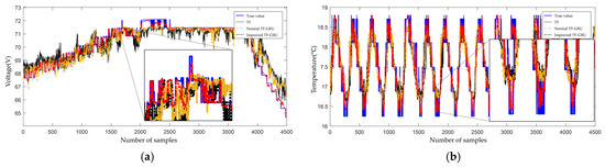 Prediction results of three models for (a) the north battery voltage and (b) the north battery temperature of a certain type of satellite.