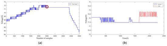 Schematic diagram of the fault occurrence time for the north battery pack of a certain type of satellite. In (a), the red circle indicates the moment when the fault occurred. Panel (b) shows the detailed normal and faulty voltage variation curves at the circled location.