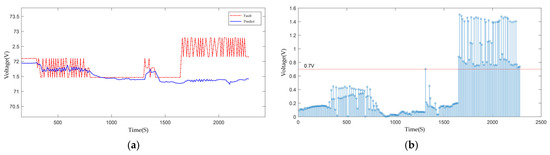 Panel (a) shows the voltage prediction and actual fault values from the improved TF-GRU model when the battery pack experienced a fault. Panel (b) illustrates the residual variation (blue line) detected by the improved TF-GRU model during the fault event. The voltage fault threshold is set at 0.7 V; when the residual exceeds this baseline, it indicates that a fault has occurred in the battery pack.