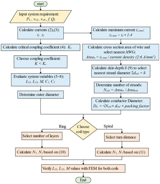 To mitigate these losses, Litz wire consists of multiple thin, individually insulated strands woven to distribute the current evenly across its cross-section. This structure ensures that the current density is uniform, thereby minimizing resistive losses. The diameter of each strand in the Litz wire is selected to be less than twice the skin depth () calculated in Equation (9) [], where represents the resistivity of copper, is the operating frequency, and is the permeability of free space. By ensuring that the strand diameter is less than 2, the design effectively minimizes the resistive losses associated with high-frequency operation []. This approach enhances the efficiency and reliability of the WPTS while meeting industry standards for performance. This careful selection of wire type and strand dimensions is a critical step in the design process, ensuring that the system achieves an optimal performance under the specified operating conditions, as shown in Figure 2. Furthermore, Figure 2 emphasizes the importance of selecting the optimum number of turns for the ring and spiral coils to achieve the desired inductive characteristics. This step is crucial for optimizing the coupling configuration and ensuring efficient power transfer under the specified operating conditions. After this design phase, the inductive characteristics of coils are validated analytically and using finite element method (FEM) simulations, as discussed in Section 4.