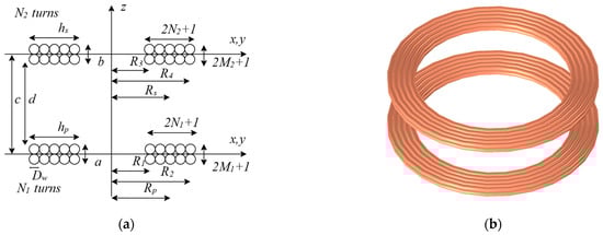 The parameters and denote the radii of the -th and -th turns of the primary and secondary coils, respectively, and are defined as follows: