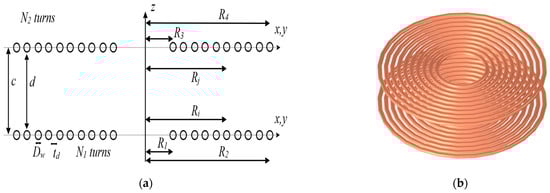 The mutual inductance of planar spiral coils can be accurately evaluated using methods derived from Neumann’s integral formula, as presented in []. This approach applies the integral in a cylindrical coordinate framework and leverages numerical techniques to determine the mutual inductance for a wide range of coil geometries and spatial configurations, including both coaxial and non-coaxial alignments. A compact, approximate formula has also been developed to improve computational efficiency while retaining a high accuracy. This alternative expression simplifies the mutual inductance calculation and achieves an error margin of 0.038% when the axial separation between the coils is less than their inner radius. The approximate formula for mutual inductance is given in Equation (22).