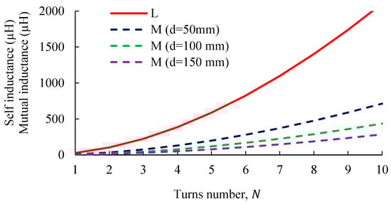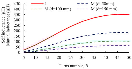 Using the above assumptions and configurations, the self-inductance of the primary and secondary coils is determined by applying the Wheeler formula [], as shown in (10). This evaluation method provides a practical framework for evaluating and optimizing coil design for optimal turn numbers, as illustrated in Figure 2.