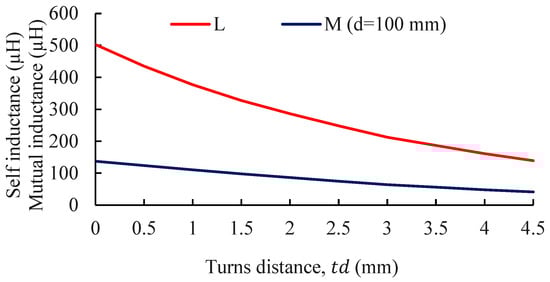 Figure 5, Figure 6 and Figure 7 illustrate how variations in the number of turns () and the turn-to-turn distance () influence the self-inductance and mutual inductance of both the ring and spiral coils. Figure 5 presents the relationship between inductance and turn number for ring coils at different coil separations. The results show that both self-inductance and mutual inductance increase nonlinearly, approximately with the square of the number of turns, consistent with (10) and (13). Notably, self-inductance remains largely unaffected by changes in the coil separation, while mutual inductance decreases as the axial distance between the coils increases, reflecting reduced magnetic coupling.