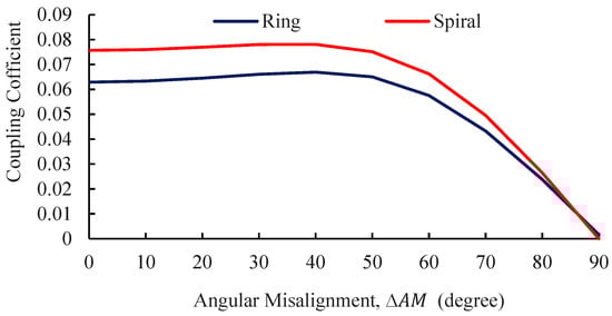 The measured coupling coefficient as a function of angular misalignment is presented in Figure 23. The results reveal a nonlinear trend: the coupling coefficient remains relatively stable at small angular misalignments but decreases sharply as the angle approaches 90°, indicating a significant degradation of magnetic coupling. The simulation model demonstrates excellent agreement with the experimental data at lower misalignment angles, with errors consistently below 6% for angles up to 50°. However, discrepancies become pronounced at larger angles, particularly at 80° and 90°. This divergence is attributed to the simulation’s assumption of ideal currents becoming less valid, combined with the more pronounced effects of unmodeled parasitic capacitances and fringing fields. Furthermore, practical alignment challenges at these extreme angles mean that minor measurement errors have a larger relative impact.