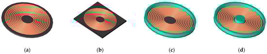 Spiral coils are distinct from ring coils, consisting of a single layer of turns, as illustrated in Figure 4. Unlike ring coils, the turns in spiral coils are spaced apart, ensuring minimal overlap and reducing proximity effects. This unique arrangement allows for efficient power transfer and is often used in WPTSs to simplify coil fabrication and improve coupling under misalignment conditions. The uniform spacing of turns in spiral coils also minimizes parasitic effects and improves magnetic field uniformity.