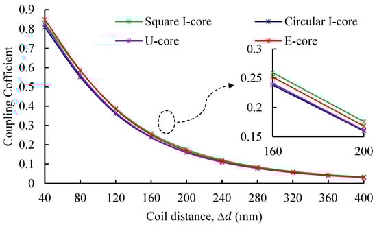 Coupling coefficient of four magnetic core structures as a function of coil distance.
