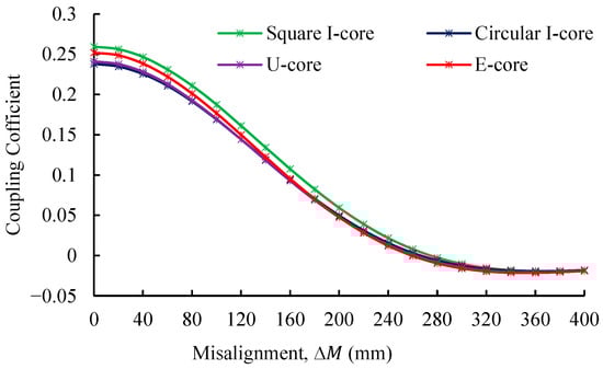 Coupling coefficient of four magnetic core structures versus horizontal misalignment at 160 mm coil distance.