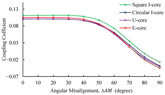 Figure 14 examines the coupling coefficient performance under angular misalignment ranging from 0° to 90° at a 250 mm distance between coils. The Square I-Core achieves its peak performance at 20°, with a coupling coefficient of 0.1116. At this point, it outperforms the Circular I-Core by 9.94%, the U-Core by 9.55%, and the E-Core by 5.92%. Beyond this peak, the coupling coefficients for all cores gradually decline as the angular misalignment increases, with the Square I-Core demonstrating a superior resilience. These findings underscore the Square I-Core’s ability to maintain a stronger coupling performance even under angular misalignment conditions.