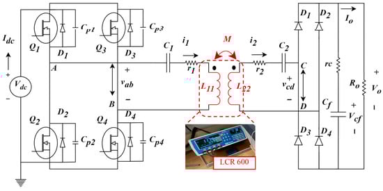 This section presents the experimental validation of four test scenarios using prototype coil structures developed according to the design methodology outlined in Figure 2 and the parameters listed in Table 1. The complete power electronics circuit used for testing, shown in Figure 15, consists of a DC voltage source that supplies a full-bridge inverter. This inverter excites the primary coil, transferring power wirelessly to the secondary coil. The secondary side is connected to a full-bridge diode rectifier to convert the AC power back to DC for the load. In each case, the coupling coefficient is experimentally measured using a precision LCR 600 m as the separation between the transmitter and receiver coils is varied. The measurements are then compared with results from finite element simulations and analytical calculations based on mutual inductance formulations.