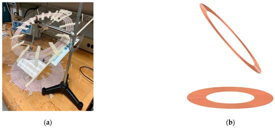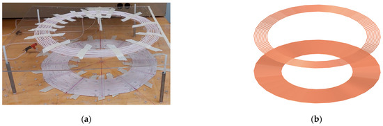 Experimental setup for the second scenario: (a) prototype of the planar coil structure and (b) corresponding 3D simulation model.