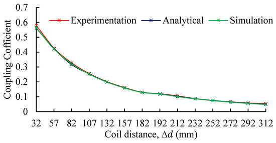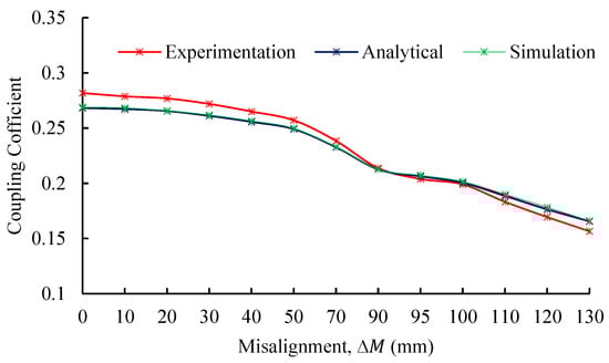 Coupling coefficient at various coil horizontal misalignments: comparison among experimental, analytical, and simulation results.