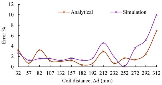 Quantitatively, Figure 18 presents the percentage error between the experimental measurements and the analytical and simulation results as a function of coil separation. The figure demonstrates that the error remains relatively low for most of the tested distances for both methods. Specifically, the analytical model maintains an error below 3.1% for most distances, with a maximum deviation of 6.8% at the largest tested separation (312 mm). The simulation-based results exhibit similar behavior, with errors generally below 5.1% and peaking at 10% at the farthest distance. At shorter coil separations (up to 182 mm), both methods show a very high fidelity, with percentage errors consistently below 3%.