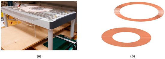 Experimental setup for the third scenario: (a) prototype of the planar coil structure and (b) corresponding 3D simulation model.