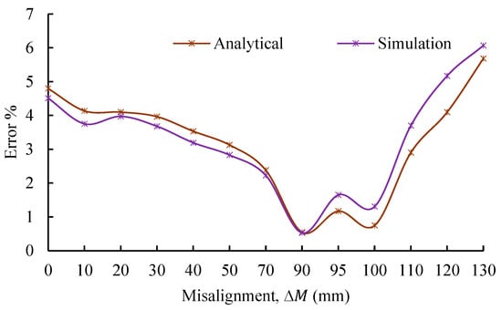 The measured coupling coefficient as a function of horizontal misalignment is illustrated in Figure 20. As the misalignment increases, the coupling coefficient gradually declines, reflecting the reduced magnetic linkage between the transmitter and receiver coils. Both analytical and simulation results closely track the experimental data across the range of tested misalignments. A quantitative assessment of model accuracy is presented in Figure 21, where the error between analytical and experimental values remains below 5%, reaching its maximum (5.68%) at 130 mm and a minimum of 0.54% at 90 mm. Similarly, the simulation error is also consistently under 5%, with a minimum of 0.53% at 90 mm and a maximum of 6.07% at 130 mm.