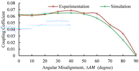Coupling coefficient at various coil angular misalignments: comparison among experimental, and simulation results.