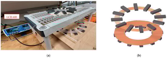 This scenario assesses the impact of integrating magnetic cores on the coupling performance. A specialized coil arrangement incorporating twelve ferrite I-cores (EPCOS I93x28x16, N87 material) is employed, with the cores uniformly distributed around the periphery of both the primary and secondary coils at 30° intervals. The physical test setup and the corresponding 3D simulation model are depicted in Figure 24a and Figure 24b, respectively.