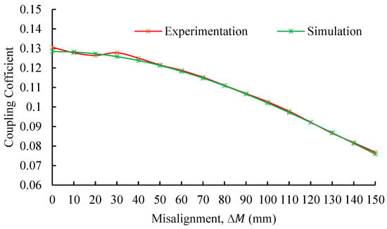 The coupling coefficient of the cored structure is measured experimentally as a function of horizontal misalignment, and the results are presented in Figure 25. The data show a gradual reduction in the coupling coefficient as the misalignment increases, showing the same trend observed in coreless configurations. Notably, the experimental measurements track the simulation model with a remarkable fidelity, exhibiting errors below 1.6% across the entire range of tested misalignments. The minimum observed error is 0.13% at 80 mm, while the most significant error of 1.65% occurs at zero misalignment, as shown in Figure 26.