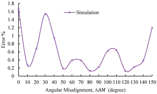 Table 6 summarizes the key findings from the experimental validation of the proposed models under four representative misalignment scenarios. For each case, the key parameter varied, typical simulation error, maximum error point, and coefficient of correlation () between the experimental and simulation results are provided. The results demonstrate strong agreement across all scenarios, with values above 0.99 for vertical, horizontal, and cored horizontal misalignments, indicating an excellent model fidelity. A lower of 0.9752 for the angular misalignment scenario reflects the model’s reduced accuracy, as discussed.