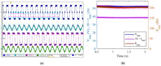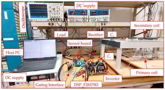 A 200 W prototype of the proposed WPTS was built for experimental verification under practical conditions. The physical implementation is depicted in Figure 27, with the system’s circuit diagram shown in Figure 15. The system operated with a DC input voltage of 130 V and consistently delivered an output voltage of 52 V across a load resistance of 13.52 Ω. The primary and secondary self-inductances were measured at 1103.3 μH and 114.1 μH, respectively, with a mutual inductance of 44.85 μH between the coils at an axial separation of 192 mm. Resonance was achieved using a 3.4 nF primary compensation capacitor and a 32.48 nF secondary compensation capacitor, yielding an operating frequency of 82.169 kHz.