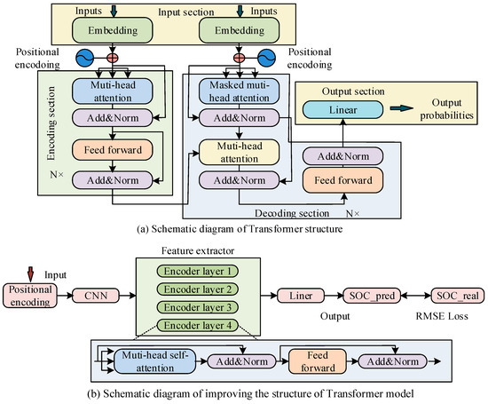 In the field of SOC prediction and related applications of lithium batteries, the application of Transformer models is gradually receiving attention. Liu et al. [12] applied the Transformer model to an integrated voltage equalizer for high-voltage energy storage systems, which successfully achieved efficient voltage balancing in the application of nine series-connected battery cells while maintaining system scalability and simplified switch control. Zheng et al. [13] proposed a battery SOC prediction method based on the Transformer model to address the voltage fluctuation management and storage integration issues of solid-state transformers and hybrid transformers. By utilizing the self-attention mechanism of Transformer, the method accurately captures the dynamic changes of batteries under different working conditions, optimizes the scheduling of battery energy storage systems and battery health management, and effectively improves the accuracy of battery SOC prediction. Xu B et al. [14] proposed a bidirectional integrated equalizer based on the Sepic Zeta converter to address the problem caused by voltage differences between batteries and supercapacitors, and they combined it with the Transformer model to accurately estimate battery SOC, optimize the control strategy of the equalizer, and simplify the complexity of hybrid energy storage systems. The Transformer model demonstrates outstanding advantages in lithium battery SOC prediction and related applications, effectively improving prediction accuracy and system performance.