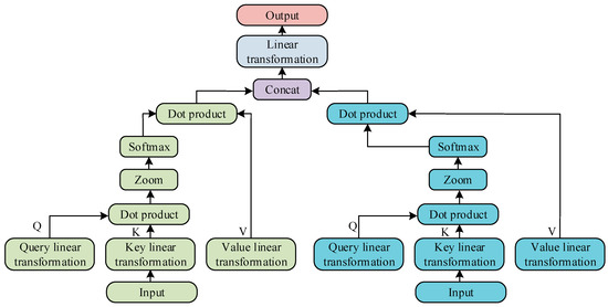 In Equation (3), represents the convolution kernel and represents the input sequence. represents the starting position of the sliding window. Since each convolution kernel generates a scalar, the amount of convolution kernels determines the number of channels in the output sequence. One-dimensional convolution can effectively extract frequency components of input sequences and trends of time series. By stacking multiple convolutional layers, more abstract features can be gradually learned. The dataset used in this study is the temperature, voltage, and current data of lithium batteries in energy storage power stations in a time series, all of which belong to one-dimensional signals. The process first extracts local features of the input data through one-dimensional convolution and then further extracts global features through the decoder module, effectively mining important information in time series data. The decoder consists of a stack of four feedforward networks and self-attention modules. Feedforward networks mainly enhance the computational performance of self-attention modules through linear transformations [23]. Due to the extraction of local feature vectors from the input data, it is necessary to improve the original self-attention module to better meet the requirements of battery state estimation. This study mainly uses multiple attention heads to capture different correlations. The detailed explanation of the dual-head SAM is denoted in Figure 2.