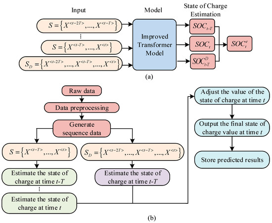 Schematic diagram and process of state-of-charge estimation for Transformer–TDSE model: (a) schematic diagram of state-of-charge estimation based on Transformer–TDSE model; (b) battery state-of-charge estimation process based on Transformer–TDSE model.