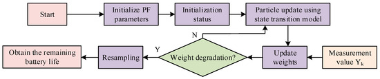 The capacity degradation of batteries is not only related to the number of charge and discharge cycles but also affected by factors such as temperature, current intensity, and charge and discharge rate. Therefore, when using a double exponential model for capacity decline prediction, multiple factors need to be comprehensively considered. In addition, due to varying battery capacities, each battery has a separate failure threshold set, which ranges from 70% to 80% of its rated capacity. Figure 4 shows the PF algorithm flowchart.