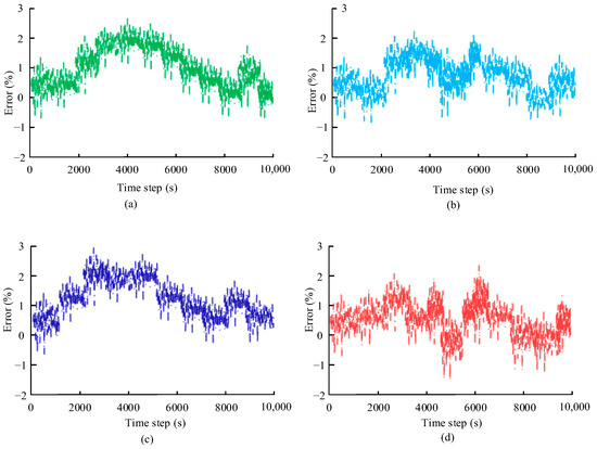 Error curves of charge and discharge state estimation for each dataset: (a) error in LiNiMnCoO2 dataset at 10 °C; (b) error in LiNiMnCoO2 dataset at 30 °C; (c) error in LiFePO4 dataset at 10 °C; (d) error in LiFePO4 dataset at 30 °C.