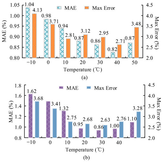 This study used MAE and Max Error as evaluation metrics to test the accuracy of the Transformer–TDSE model in estimating the SOC of batteries on the LiNiMnCoO2 dataset and LiFePO4 dataset. Among them, the testing temperatures included −10 °C, 0 °C, 10 °C, 20 °C, 30 °C, 40 °C, and 50 °C. The test findings are denoted in Figure 6. According to Figure 6a, in the LiNiMnCoO2 dataset, the MAE of the Transformer–TDSE model was 0.98% at 0 °C and only 0.82% at 40 °C. Meanwhile, the Max Error of the model was only 2.71% at a temperature of 40 °C and 2.81% at a temperature of 10 °C. In addition, the MAE value of the Transformer–TDSE model at extreme low temperatures of −10 °C was 1.04%, and the Max Error was 4.13%, both of which were higher than other temperatures. The MAE value and Max Error at an extreme high temperature of 50 °C were 0.87% and 3.48%, respectively, which showed little change compared to the indicator value at the optimal temperature. The Transformer–TDSE model was capable of adapting to battery SOCE tasks in various temperature environments, and maintained high accuracy performance even under high- and low-temperature conditions. According to Figure 6b, in the LiFePO4 dataset, the highest and lowest MAE values of the Transformer–TDSE model were only 1.48% and 0.86%, respectively, corresponding to temperatures of 0 °C and 30 °C. Meanwhile, the Max Error value of this model was as low as 0.95%. The Transformer–TDSE model demonstrated high accuracy in estimating the SOC of batteries. Meanwhile, the MAE value and Max Error of the Transformer–TDSE model at extreme low temperatures of −10 °C were 1.62% and 3.68%, respectively. The MAE value and Max Error at an extreme high temperature of 50 °C were 1.10% and 3.28%, respectively, slightly higher than the indicator value at the optimal temperature. The Transformer–TDSE model demonstrated high accuracy in estimating battery SOC at different temperatures.