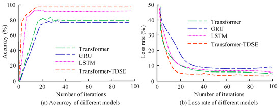 To further demonstrate the superiority of the Transformer–TDSE model, a comparison was made between the basic Transformer model, Gated Recurrent Unit (GRU), and long short-term memory (LSTM) network. The experiment mainly explored the accuracy of estimating the SOC of LIB using different models at different temperatures. The data set used was the LiNiMnCoO2 discharge data set with a training set of 70% and a test set of 30%. This study first tested the training accuracy and loss rate of each model, as denoted in Figure 7. In Figure 7a, compared with other models, the Transformer–TDSE model had the highest accuracy, converging to 98.64% after about 20 iterations. The GRU model only stabilized after 38 iterations, with an accuracy rate of only 76.89%. This indicated that the Transformer–TDSE model could quickly and effectively fit battery SOC data. In contrast, the GRU model only stabilized after 38 iterations, and the final accuracy was only 76.89%, significantly lower than the Transformer–TDSE model. This indicated that the learning process of the GRU model was relatively slow, and its fitting ability was relatively weak, which cannot achieve the high accuracy of Transformer–TDSE. As shown in Figure 7b, the loss rate of the Transformer–TDSE model was significantly lower than the other models, only 3.75%, which was 5.10% and 5.82% lower than the Transformer model and LSTM model, respectively. Meanwhile, the Transformer–TDSE model only converged 18 times. Compared with other models, the Transformer–TDSE model had faster model training speed and accuracy.