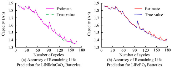 Capacity prediction results of PF algorithm for different LIB: (a) accuracy of RLP for LiNiMnCoO2 batteries; (b) accuracy of RLP for LiFePO4 batteries.